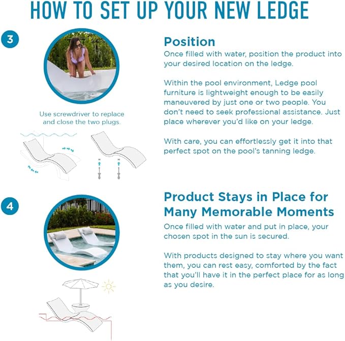 - MINIMAL ASSEMBLY - Fill completely with water to avoid buoyancy in your pool by fully submerging and rotating in the water. Tilt the chaise as you place on your ledge to remove any bubbles or pockets of air away from the feet. Lay back and enjoy your own personal oasis.