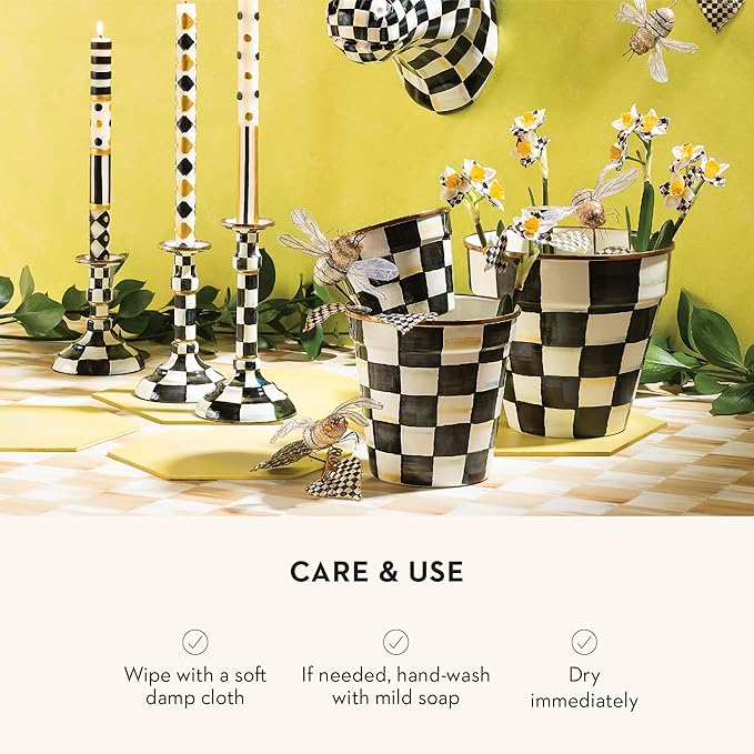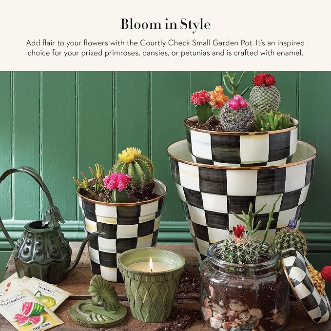 MACKENZIE-CHILDS Enamel Garden Pot, Planting Pot for Plants and Flowers, Small, Black-and-White Courtly Check