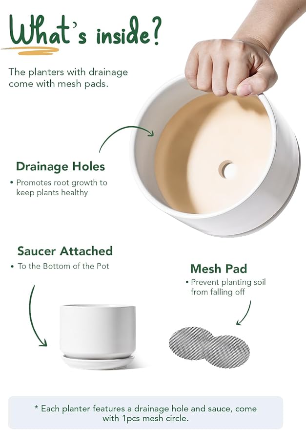 - Pots with Drainage Hole, Drip Pans, Drainage Net: The hold in the bottom allows the excess water to exit out of the soil when you’re watering the plant; The drainage plates are attached to the bottom of the pots and do not come off; Drainage Net is included, which is designed to prevent planting soil from falling off (Plant is not Included)