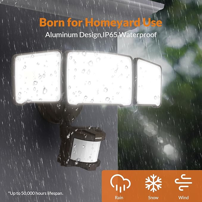 LEPOWER LED Security Light Motion Sensor Light Outdoor, 38W 4200LM Motion Security Light, 5500K, IP65 Waterproof, 3 Head Motion Detected Flood Light for Garage, Yard, Porch (Not Solar Powered, Brown)
