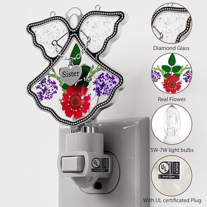 - ❤ Detail: The frame of the new stained glass angel night light is made of electroplated silver & zircon material, Which is firm and textured, really dried flowers pressed between bottom in glass , Three lavender metal heart pendants on the bottom, and the wings is stained glass ,one of the pendants has a heart-shaped tag hanging on it, Which is engraved with " Sister", it's a nice gift to express your love to your sister.