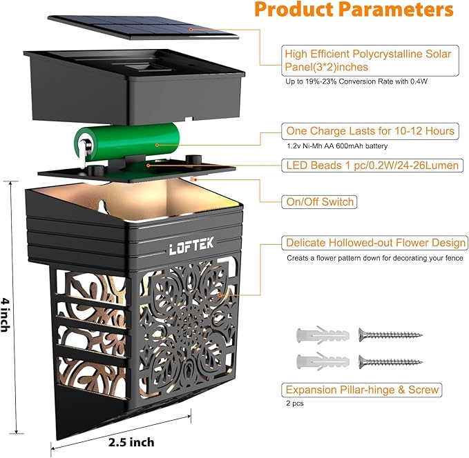 - 【𝐃𝐞𝐜𝐨𝐫𝐚𝐭𝐢𝐯𝐞 𝐒𝐨𝐥𝐚𝐫 𝐅𝐞𝐧𝐜𝐞 𝐋𝐢𝐠𝐡𝐭𝐬】- LOFTEK warm white solar fence lights adopts advanced LED chips and all side Hollowed-out visible lampshade design provides brighter lighting and a wider detection range. It cast a pretty flower pattern that looks gorgeous and adds a nice aesthetic to your garden backyard. 26 lumens brightness is eyes protection and energy-saving than general fence lights. With our solar outdoor lights, you will get many compliments from neighbors. Suitable for Christmas decoration.