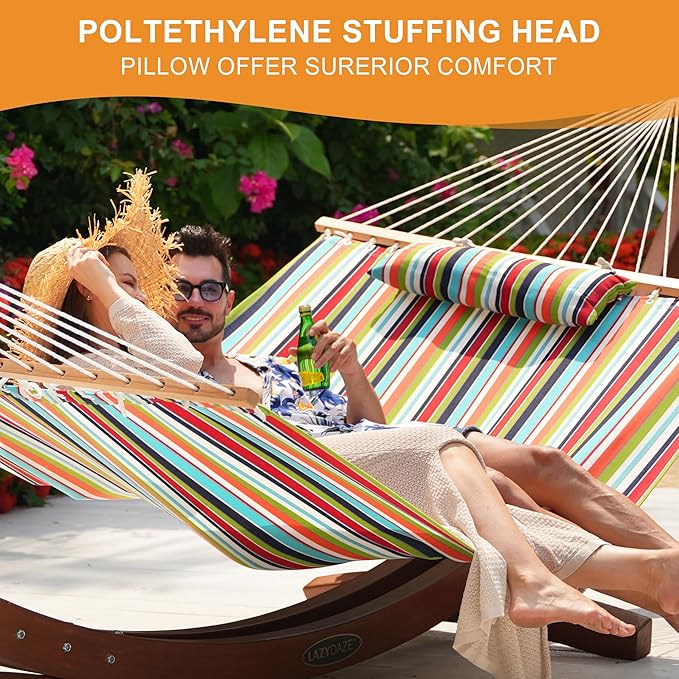 - LAZY DAZE HAMMOCKS: Lazy Daze Hammocks are large enough to accommodate 2 people. The hammock bed size is 77 inches x 55 inches. A 12-feet hammock with 2 steel chain links. Double hammock with wood spreader bar, 55 inches durable hardwood spreader bar made of FSC-Certified wood, it’s designed to safely support a maximum capacity of 450 pounds