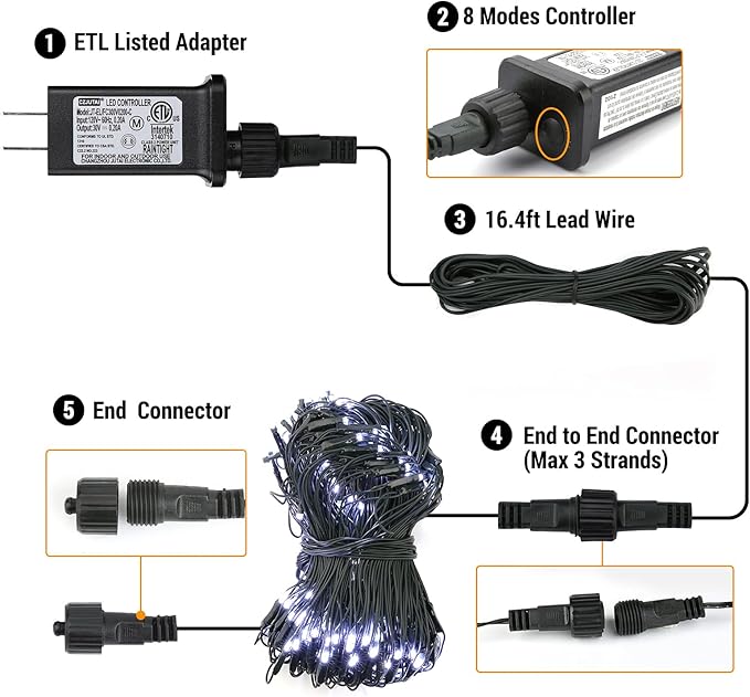 - Low Voltage & Connectable: The output voltage of the adapter Christmas net lights is 30V, lower than standard safe voltage 36V to ensure your safety. Compatible with all of USA standard outlet, the power is only 6W, with ETL Certification, that is safe and energy saving. And it comes with end to end connector, can be connected for 3 net string lights.