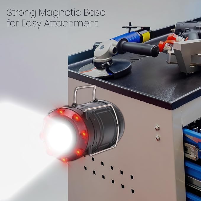 - COMPACT & COLLAPSIBLE: Foldaway handles for suspension, collapses for storage; No switches: pull up handles for brightness control; 4-in-1 flashlight and lantern, Red warning light strobe and SOS, hangs easily; 3 strong magnets for hands-free metal attachment