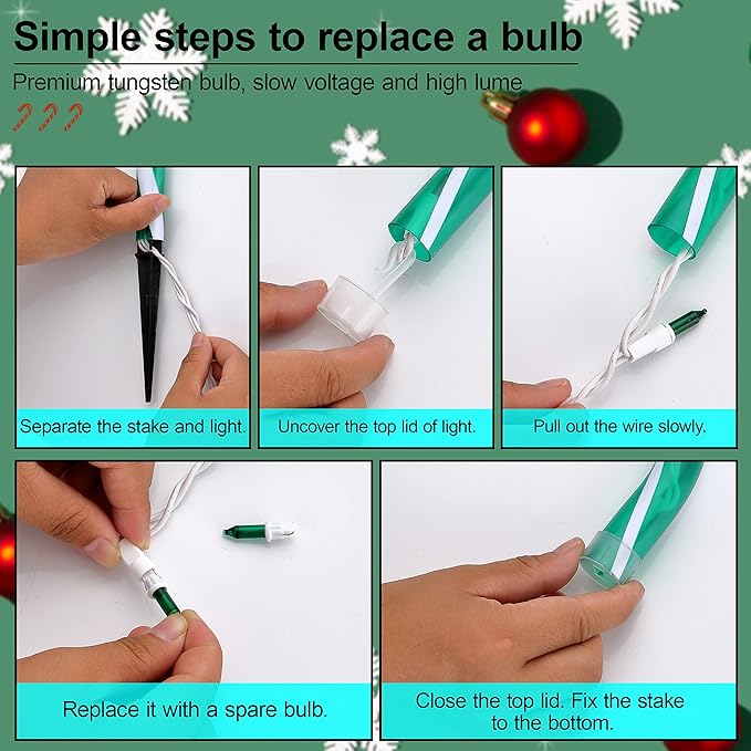 - 【Easy to Install】These Christmas outdoor candy cane lights come with 10 ground stakes. Just insert the stake into the candy cane, then press the stakes into the ground.