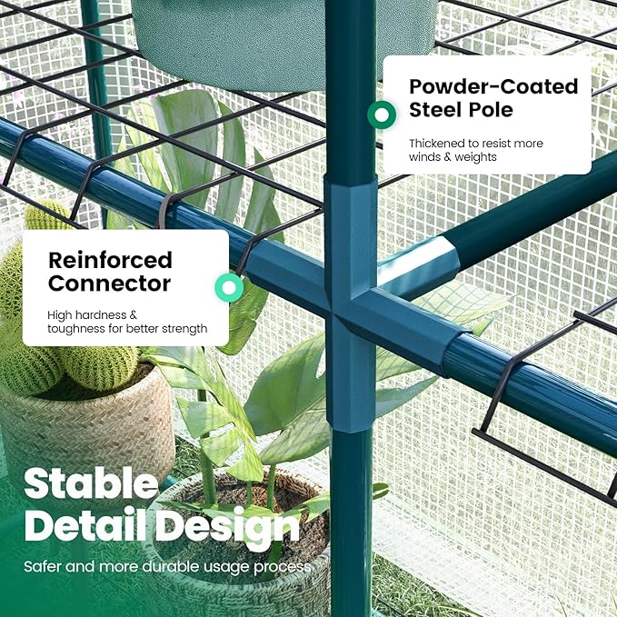- [Upgraded Cover Material]--Reinforced 145g/㎡ (Others: 135g/㎡) green PE grid cover which is added 6% Anti-UV inhibitor, makes longer greenhouse service life possible. No worries - all safe eco-friendly materials are selected to make your plants all good.