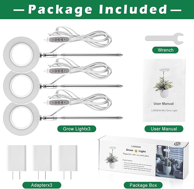 LORDEM Grow Light, Full Spectrum LED Plant Light for Indoor Plants, Height Adjustable Growing Lamp with Auto On/Off Timer 4/8/12H, 4 Dimmable Brightness, Ideal for Small Plants, 3 Packs