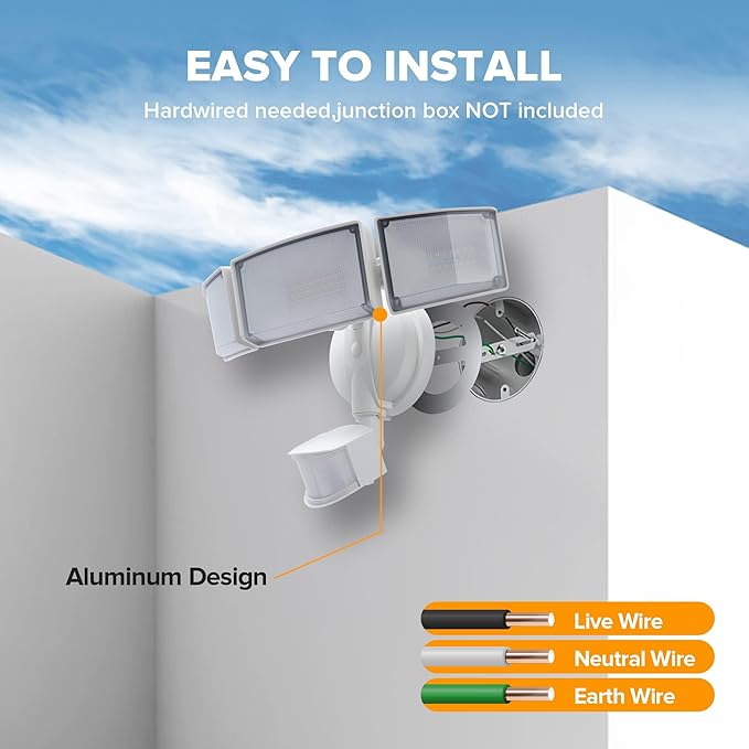 - METAL AND ROTATABLE DESIGN: Adjustable heads provide a customizable coverage area. Aluminum material, IP65 waterproof and 50,000hrs lifespan, make this security light pecfect for the porch, back yard, front door, garage, driveway, walkway, step, etc.