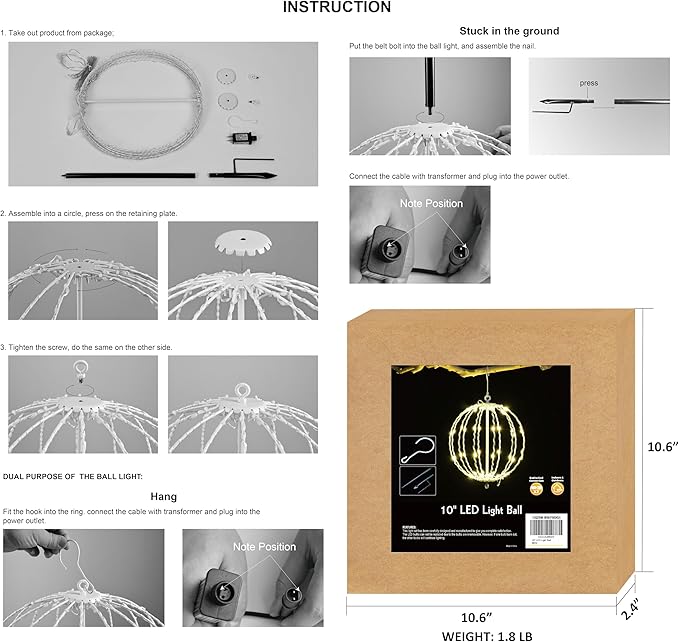 - LED BALL CHRISTMAS LIGHTS: This iron ball light has a novel design, which is composed of a 10inch foldable metal frame and LED fairy lights wrapped separately on the structure; Light up your house and garden at night, create a strong holiday atmosphere