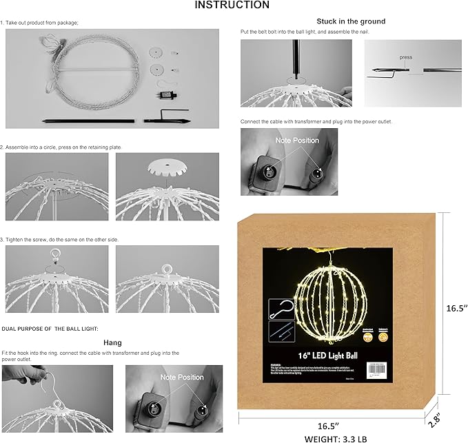- LED BALL CHRISTMAS LIGHTS: This iron ball light has a novel design, which is composed of a 16inch foldable metal frame and LED fairy lights wrapped separately on the structure; Light up your house and garden at night, create a strong holiday atmosphere