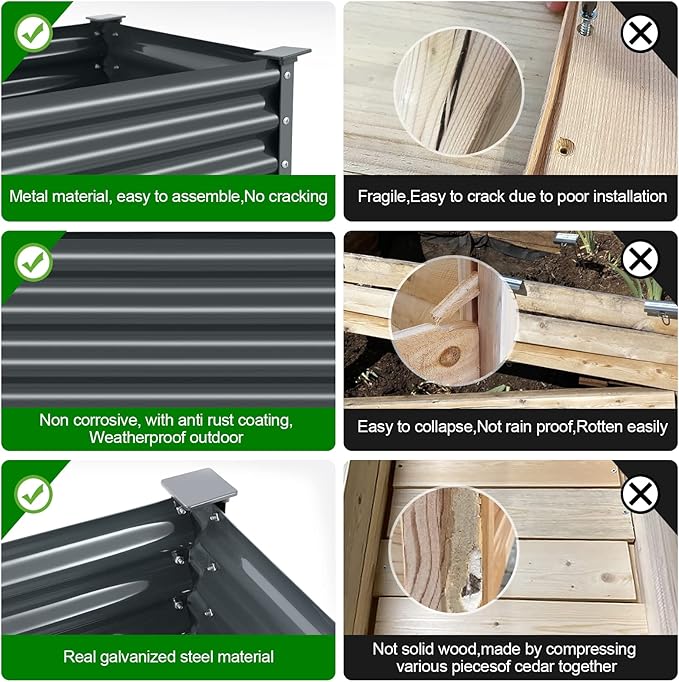 - Multipurpose: The galvanized raised garden bed is durable and strong load-bearing, it can provide ample growing space for plants. We can use it to grow vegetables, fruits and herbs. This metal raised beds for gardening can be used both indoors and outdoors, it is suitable for gardens, backyards, balconies and other places.