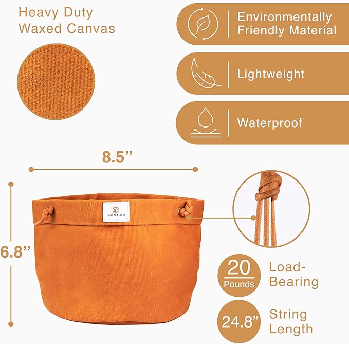- Its carefully crafted waxed canvas material comes fastened with 3 flexible, weight-bearing ropes to hold your indoor plants in place and keep your plant pot in shape. The ropes of our hanging planter measure 24” in length, giving you enough length to work with. Shorten or lengthen by readjusting the knots to your desired height and voila!