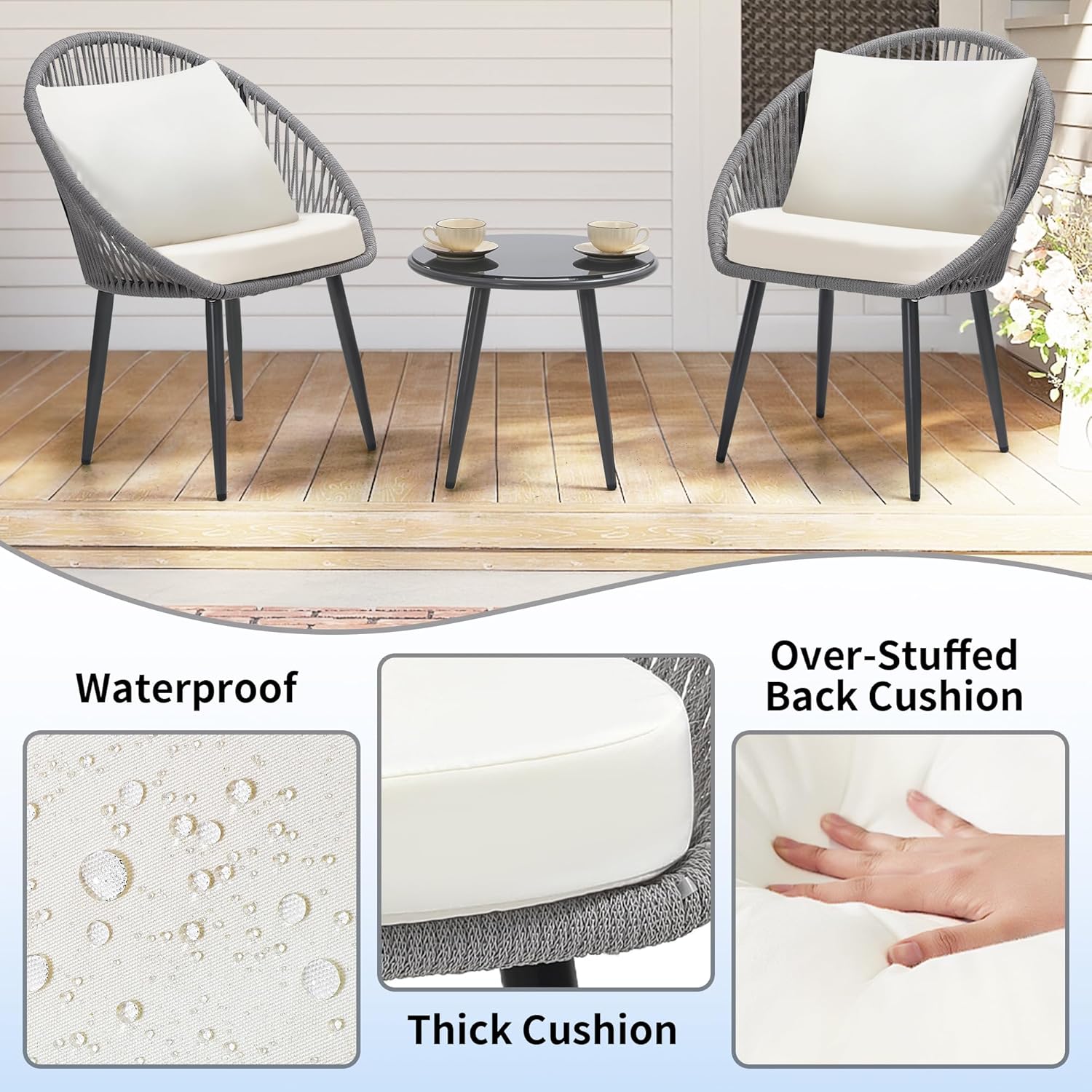 - 【15 MINUTE ASSEMBLY】 Each 3 pieces bistro set includes 2 chairs, 1 coffee table with a tempered glass top, 2 overstuffed waterproof zippered cushions and 2 pillows. Designed for simple, intuitive assembly with included tool and instructions.Of course, should you have any issue or questions our customer service team always responds quickly.