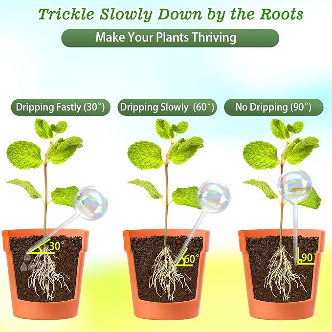 - Easy to Use: Step 1:Dig a hole in the soil with a tool; Step 2:Fill the watering ball with water; Step 3:Tie a cotton cloth around the nozzle; Step 4:Insert the plant waterer into the hole; This plant watering globe can distribute water for 1 weeks, and you can adjust the water droplet rate by adjusting the waterer tilt angle and soil looseness.