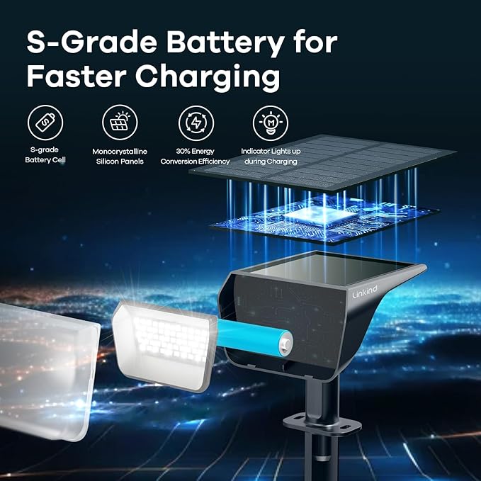- Ultra-Long Battery Life and Solar Charging: Solar spotlights outdoors featuring a 1,500mAh lithium polymer battery charge efficiently during the day using solar energy. With a 30% energy conversion rate, they provide long-lasting brightness at night, reducing electricity costs. Tip: Before first use, allow the solar lights to charge for 48 hours under direct sunlight