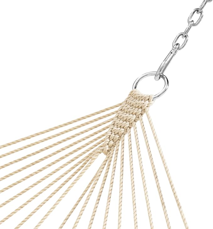 - Adapts to 12-13FT hammock stand: The hammock has an overall length of 126 inches and comes with two chains (each link is 7.4 inches long);Due to the way the hammock is woven, it stretches when in use,so 12-13FT hammock stand is required