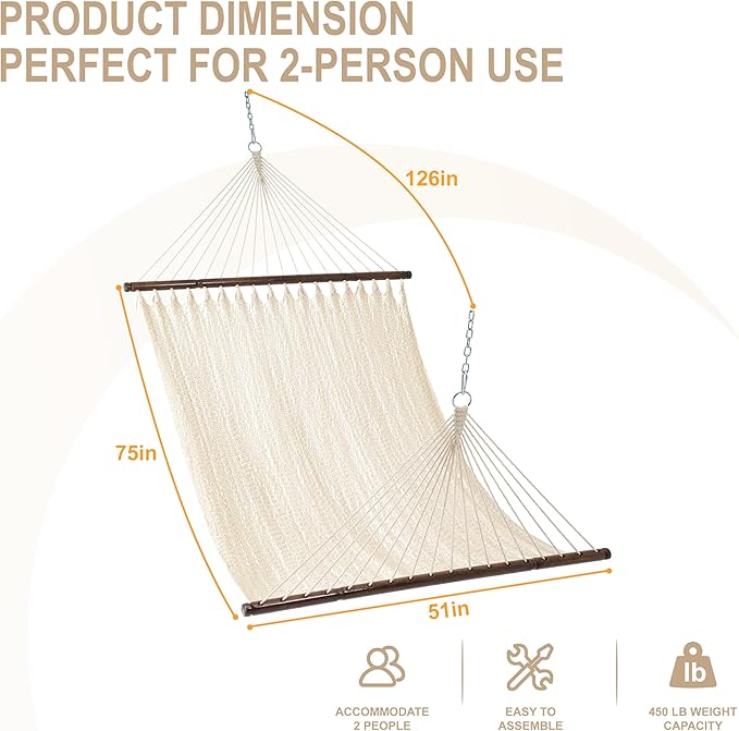 - Extra Large Hammock: Hammock bed dimensions: 75 x 51 inches, it provides plenty of room for you to spread out and relax; The weight capacity of the double hammock can reach to 450 pounds which allows 2 person to hanging in the hammock; It’s time to have one Lazy Daze Caribbean Hammock