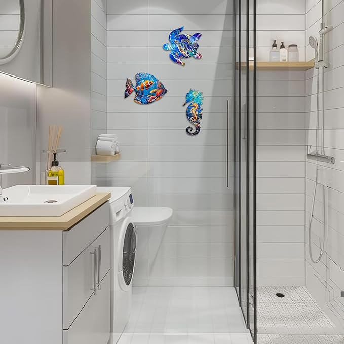 LIFFY Metal Fish Wall Decor Fish Metal Wall Art Ocean Themed Sea Turtle Fish Seahorse Coastal Wall Sculpture, Nautical Outdoor Decor For Garden, Fence, Patio, Pool,Beach,Bathroom (3 Pcs)