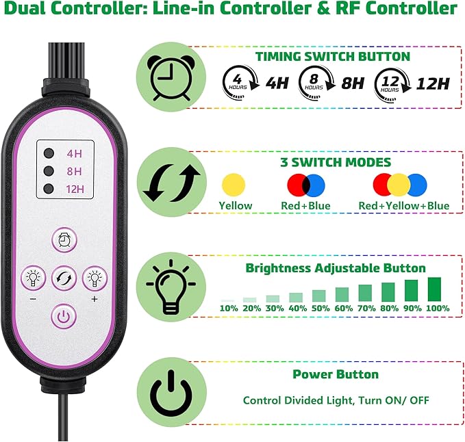 - Timing function and dual controller: This plant light comes with both an inline controller and an RF controller (effective up to 30 meters away). You can set them up for automatic lighting intervals of 4H / 8H / 12H, with auto on/off, eliminating the need for daily manual operation. Each LED head can be controlled independently