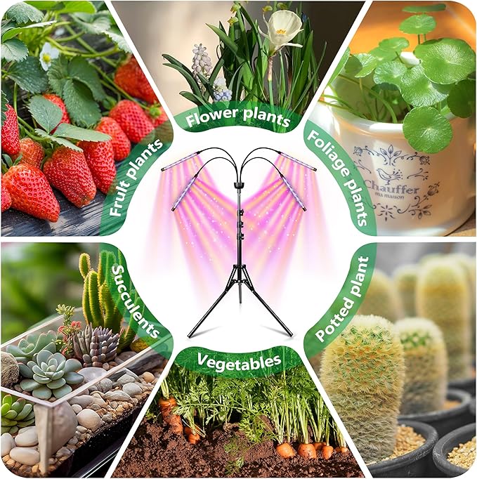 - Adjustable height and angle: This grow light lamp with a tripod stand can be extended from 15” to 63”. The flexible goosenecks can be rotated 360 degrees, allowing you to easily adjust the desired height and angle to suit your plants' needs