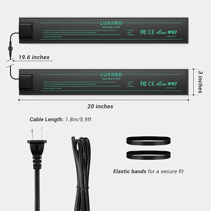 - Package: It includes 2 heating mats, 2 rubber bands to secure the mats, 2 temperature strips to easily understand the current temperature and a user manual for instructions