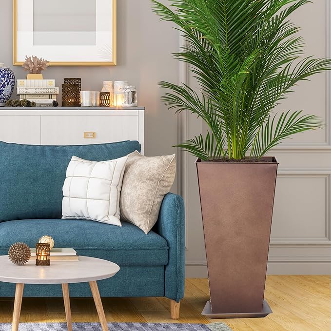 KOL 25''H. Tall Galvanized Steel Planter with Saucer, Set of 2, Planter Pots with Drainage Hole for Indoor & Outdoor Use, Decorative Flower Plant Pots for Front Porch, Patio, Deck - Rust Color