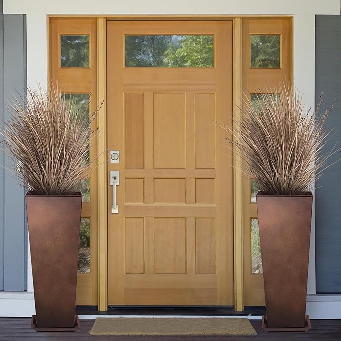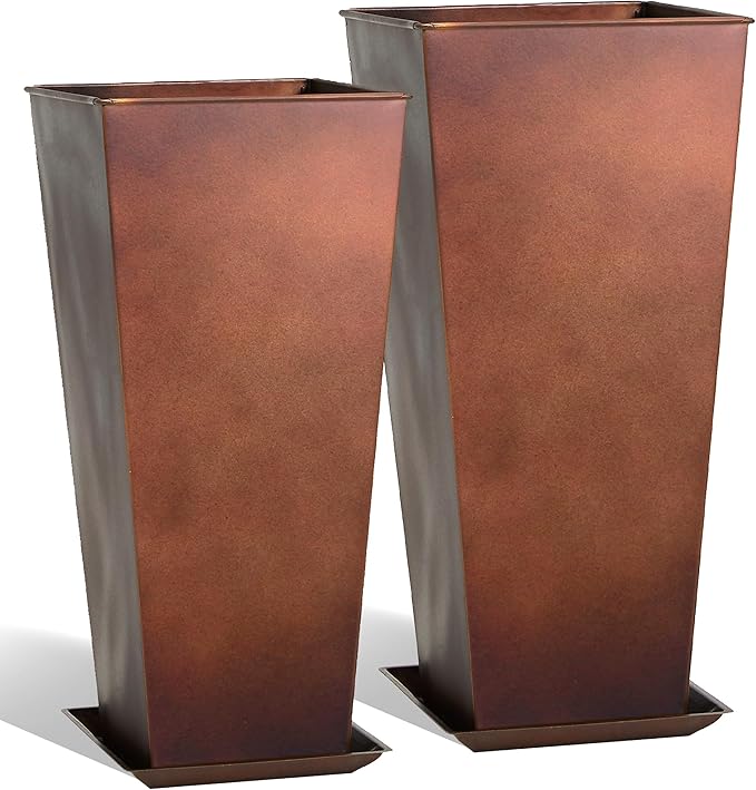 KOL 25'' & 28'' Tall Galvanized Steel Planter with Saucer, Metal Planter Pots for Indoor & Outdoor Use, Decorative Flower Plant Pots with Drainage Hole for Front Porch, Patio, Deck - Rust Color