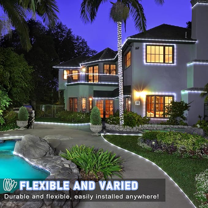 - 【Safe and Reliable】- The Christmas lights outdoor is covered with a transparent and thick PVC tubes that allows full 360° all-round lighting, delivering a full and even lighting experience. Plus, the 100ft rope lights feature a UL-certified 30V low-voltage power adapter. It won't overheat for a long time of use and is safe for kids and pets.