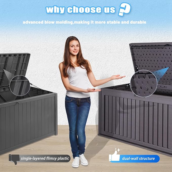 - VERSATILE STORAGE SOLUTION: Designed to seamlessly blend into any yard or patio setting, this patio storage box serves multiple purposes. From storing furniture cushions to gardening tools, sports equipment, and pool accessories, its spacious interior provides convenient storage for a variety of items.