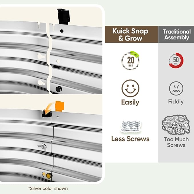 - 【Kuick Snap & Grow】Tired of spending hours bending over to assemble a raised garden bed? Our patented Snap-Lock technology eliminates 75% of screws, allowing you to easily interlock the metal panels like building blocks, so you can assemble it quickly during a coffee break.