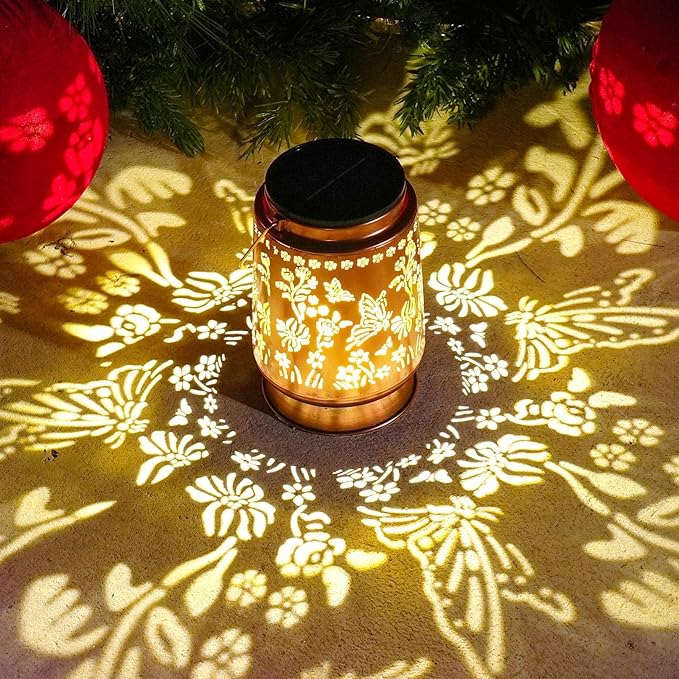 - [Larger Size & Gift Choice]: This hanging solar lantern with outdoor comes in a bigger size lantern: 5.91*5.91*14.57 inches, with howlled butterfly design,suitable not only as outdoor decoration but also as a festive gift for friends and family. With its exquisite design and unique symbolism, it makes an ideal present for Christmas
