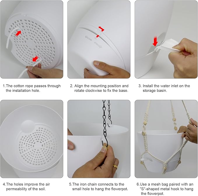 - 【Self-Watering Hanging Planter with Removable Tray】This hanging flower pot comes with a detachable bottom tray that acts as a water reservoir, holding a good amount of water. When your plant needs water, it’s absorbed through cotton wicks from the reservoir to the soil, reducing how often you need to water