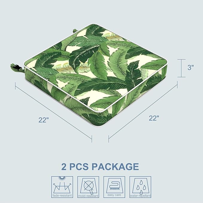 - PACKAGING: Includes 2-Pack outdoor chair cushions 22" x 22" x 3", perfect for patio chairs, garden sofas and more. Due to the vacuum compressed status, please allow 48 hours to restore thickness after opening the package