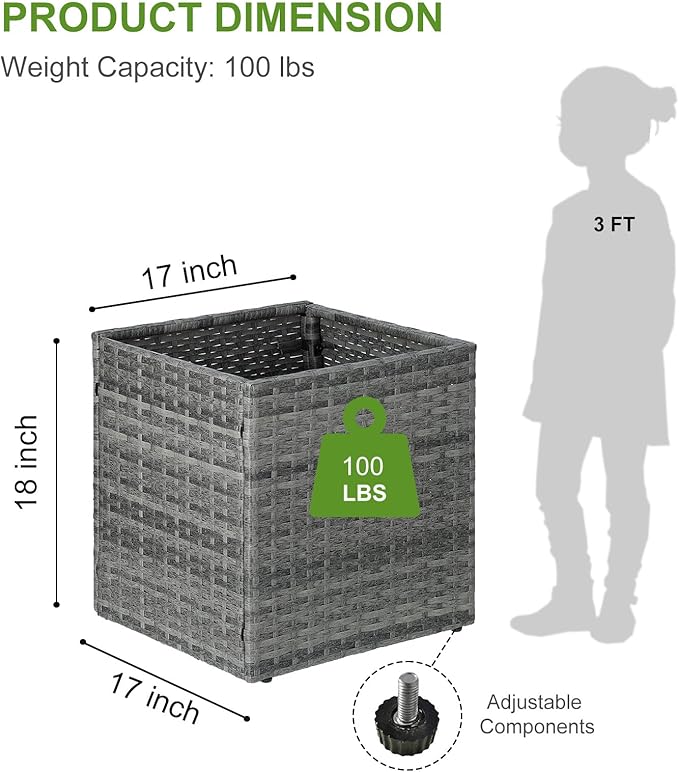 - Removable Liner: Each wicker planter in this set comes with a nonwoven fabric liner (measures 16 x 16 x 17 inch) that separates wicker from the soil. Keep planter in excellent condition to prevent weeds and other invasive species from interfering with plant growth