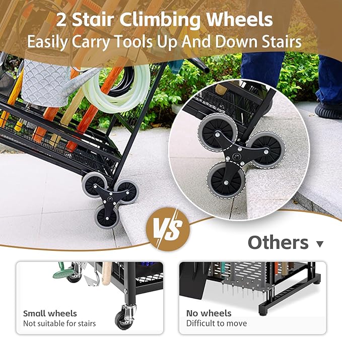 - Designed for Ultimate Convenience: Our garden tool cart with wheels has 2 stair climbing wheels and 2 lockable wheels, making it easy to transport all your tools to the yard or wherever you need them in one trip. The stair climbing wheels provide extra convenience where there are steps, allowing you to move the tool rack between yards, driveways and gardens with less effort