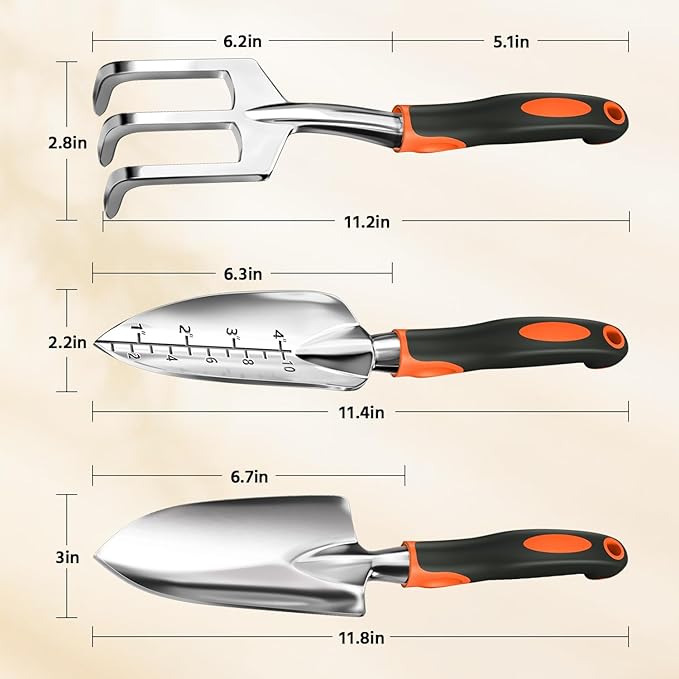 - 【All-in-One Gardening Kit】This 3-piece set includes a trowel, transplanter, and cultivator, providing all the tools you need for planting, digging, and soil cultivation. Enjoy exceptional value and versatility solution that makes your gardening more enjoyable, and more efficient.