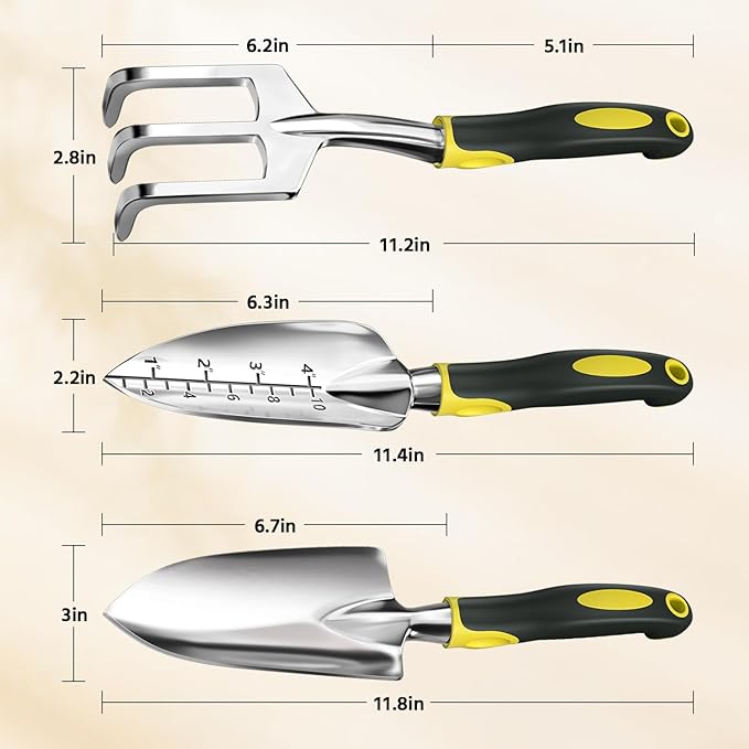 - 【All-in-One Gardening Kit】This 3-piece set includes a trowel, transplanter, and cultivator, providing all the tools you need for planting, digging, and soil cultivation. Enjoy exceptional value and versatility solution that makes your gardening more enjoyable, and more efficient.