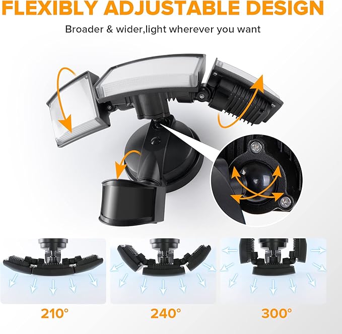 - METAL AND ROTATABLE DESIGN: Adjustable heads provide a customizable coverage area. Aluminum material, IP65 waterproof and 50,000hrs lifespan, make this security light pecfect for the porch, back yard, front door, garage, driveway, walkway, step, etc.