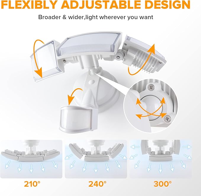 - METAL AND ROTATABLE DESIGN: Adjustable heads provide a customizable coverage area. Aluminum material, IP65 waterproof and 50,000hrs lifespan, make this security light pecfect for the porch, back yard, front door, garage, driveway, walkway, step, etc.