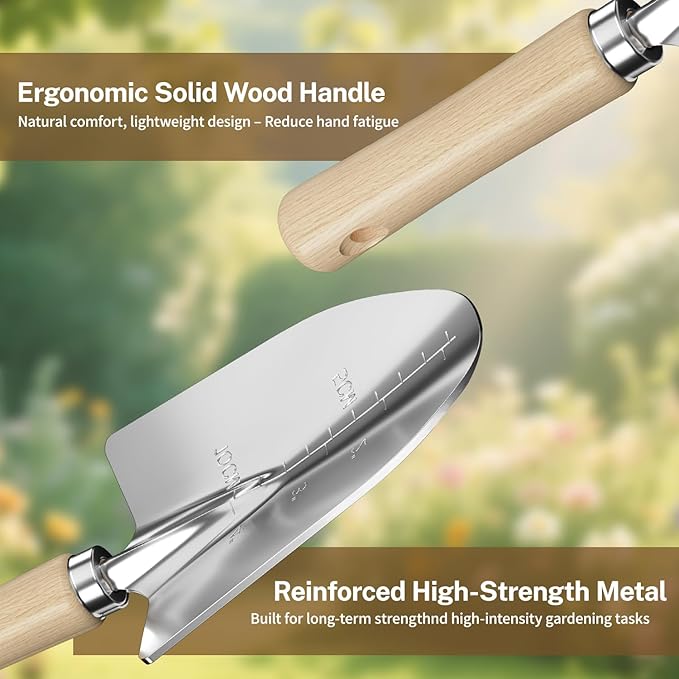 - 【Plant with Precision and Confidence】Our shovel blades feature clear depth markings, guiding you to plant or transplant seedlings at the perfect depth every time. Whether you're a beginner taking your first steps in gardening or an experienced green thumb, these precise markings ensure your plants get the best start.
