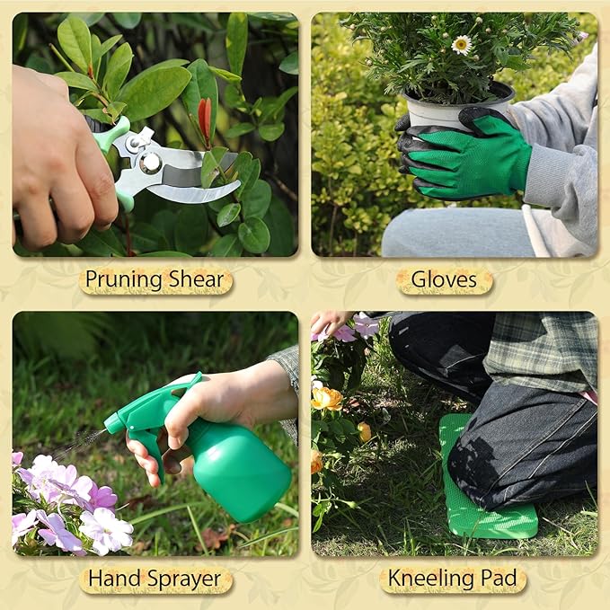 - [ 10-in-1 Garden Tool Kit ] Designed for beginners, this gardening tool set includes all the essentials: hand rake, weeder, transplanter, trowel, pruning shears, gloves, sprayer, and more. Whether planting, weeding, or pruning, these tools cover basic gardening tasks with ease.