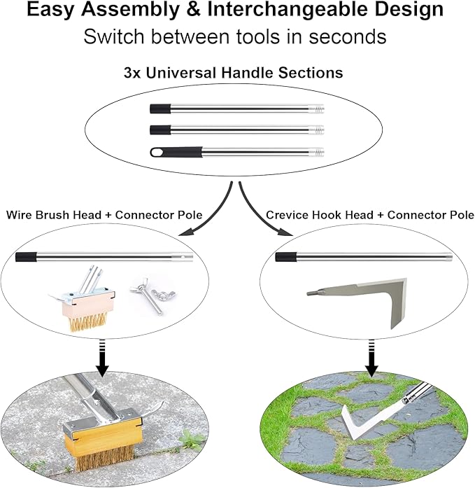 - 【2-in-1 Crack Weeder Tool with Interchangeable Use】Switch easily between a sharp crevice hook and a durable wire brush — two independent weeding tools designed for cleaning weeds, moss, and debris from patio joints, paver cracks, sidewalks, and driveways without juggling multiple tools