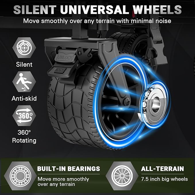 - [All-Terrain 360°Silent Swivel Wheels]Glide smoothly over sand, gravel, grass, or uneven pavement with premium noiseless wheels. The 360-degree rotation provides effortless maneuverability, while the rugged tread design ensures stability on any surface